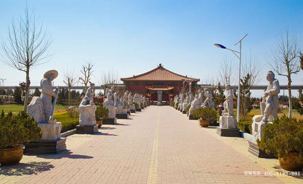 天津西城寝园公墓门前,耸立着具有汉代特色的牌楼,熠熠生辉。园中的金字塔替代了通行的影壁,12生肖跃然其上,栩栩如生,九龙昂首前瞻,吞云吐水,使人一望便可感悟到人生有限、生命无极。寝园分为日松苑、月鹤苑、星延苑、辰年苑四区,梅山池、兰清池、竹水池、菊秀池四湖散布其间。